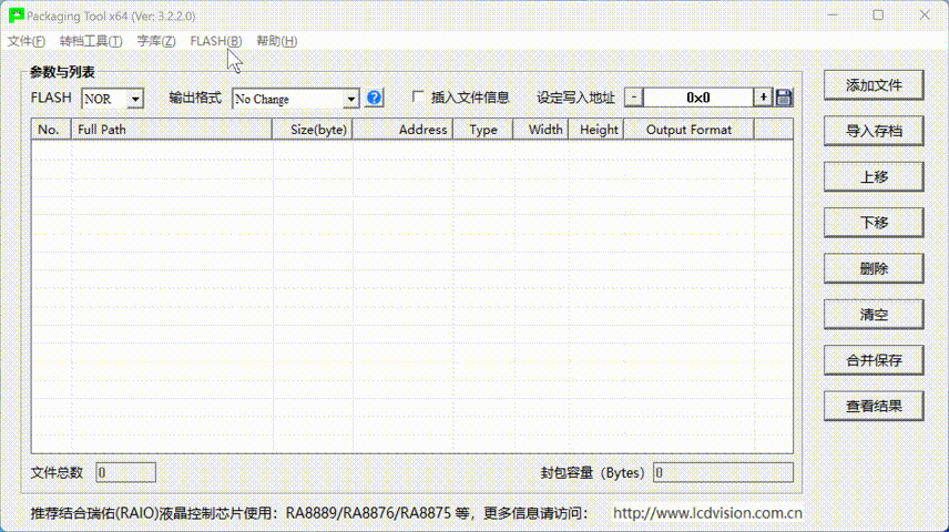 最新版本:PackagingTool Ver 3.2.2.0(1) 增加FLASH烧录功能,可对RAIO扩展的FLASH进行烧录(2) 烧录功能需要结合单片机开发板RT8H8K001使用(MCU型号:STC8H8K64U/STC32G12K128)(3) 修正预览图片窗口显示不出汉字文件名的问题*****您可至淘宝店铺购买配套开发板:https://shop124860398.taobao.com/